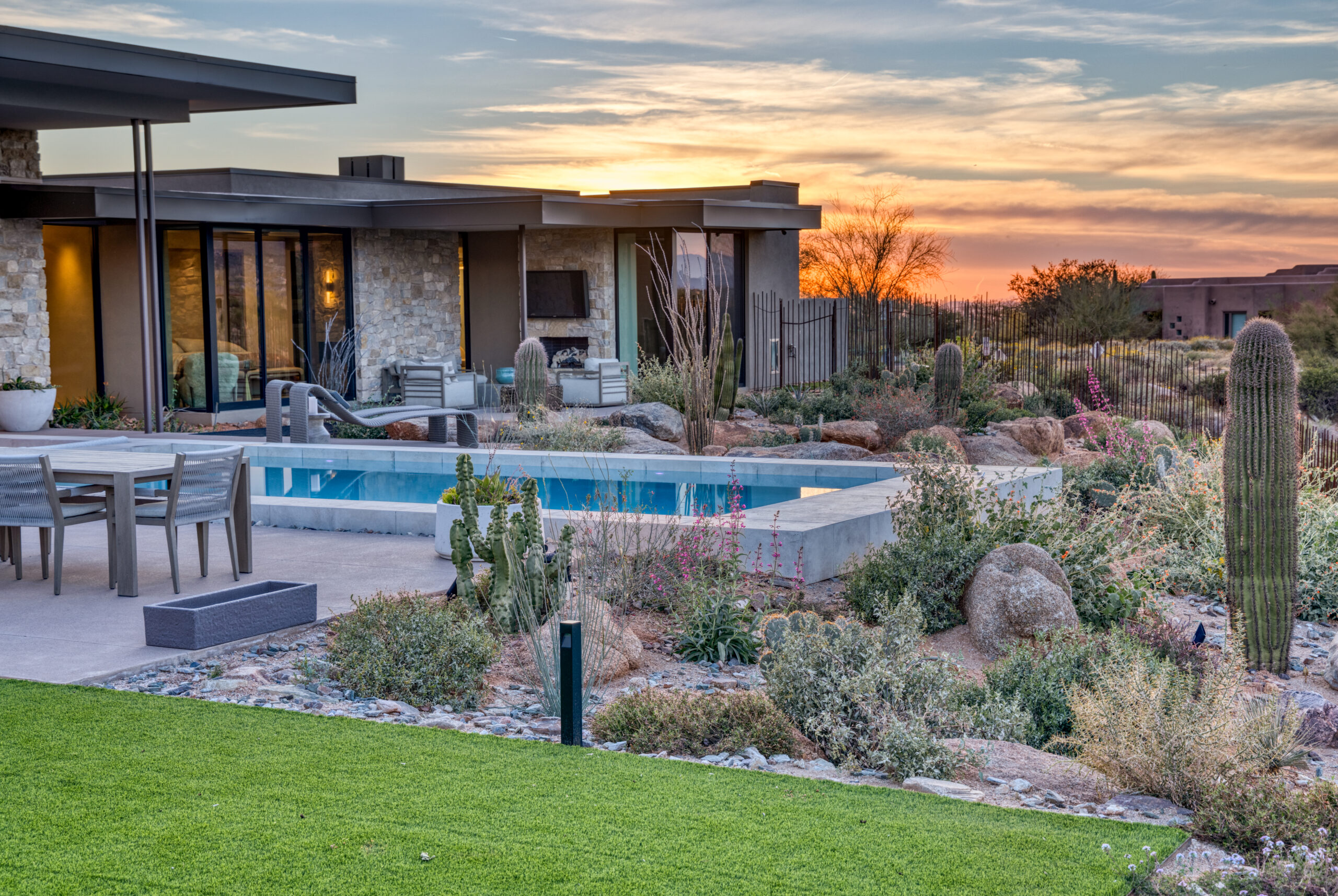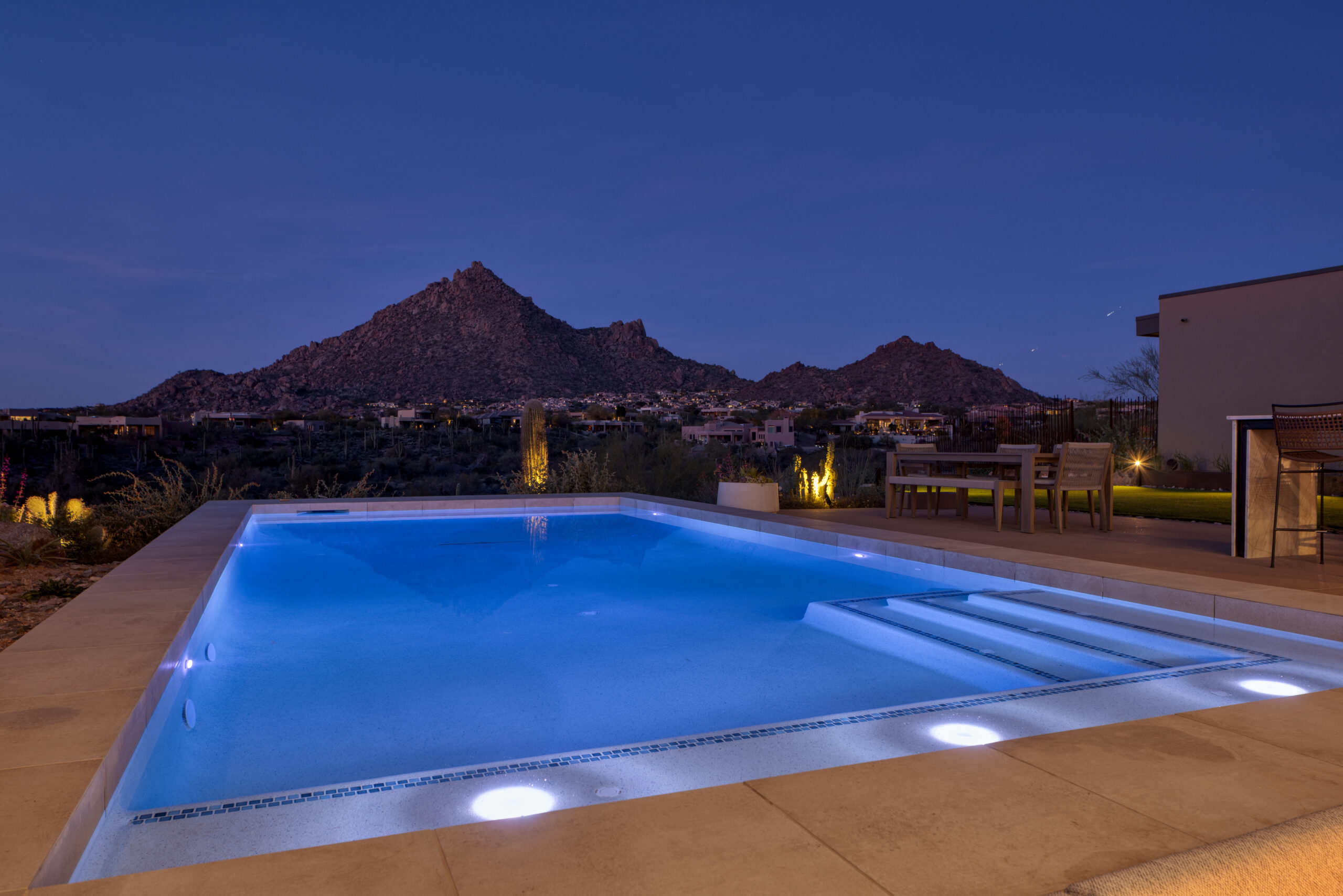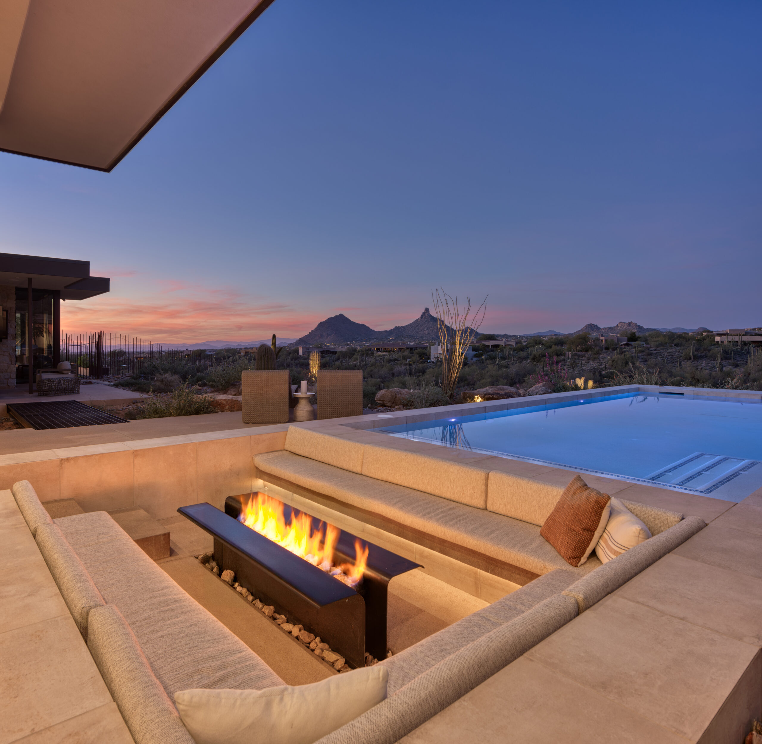 The centerpiece of the space is a sleek, modern pool positioned to frame unobstructed mountain views, complete with a Baja shelf and integrated lighting that transforms the space from a serene daytime retreat into a dramatic evening experience. Just steps away, a sunken fire lounge offers a more intimate setting — designed for conversation, relaxation, and enjoying Arizona’s desert nights.