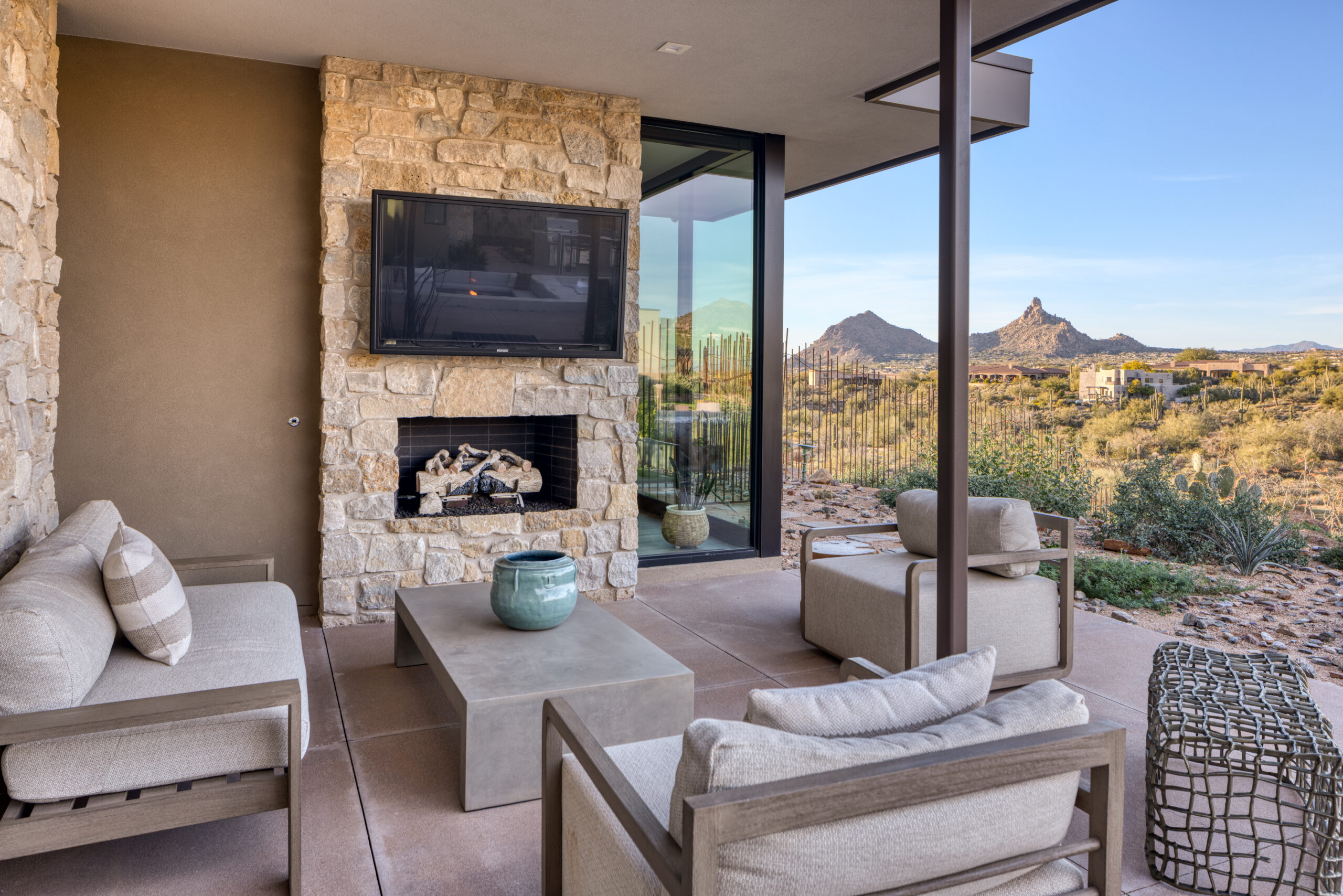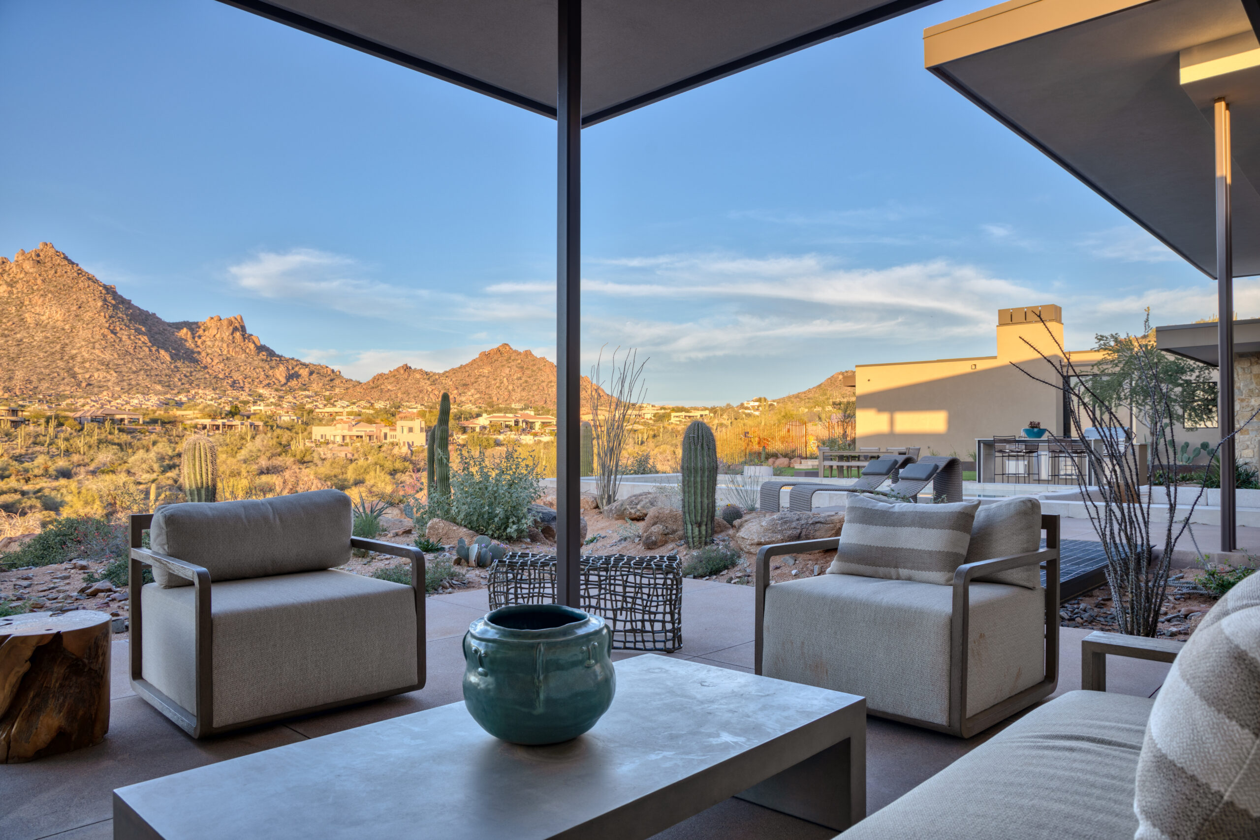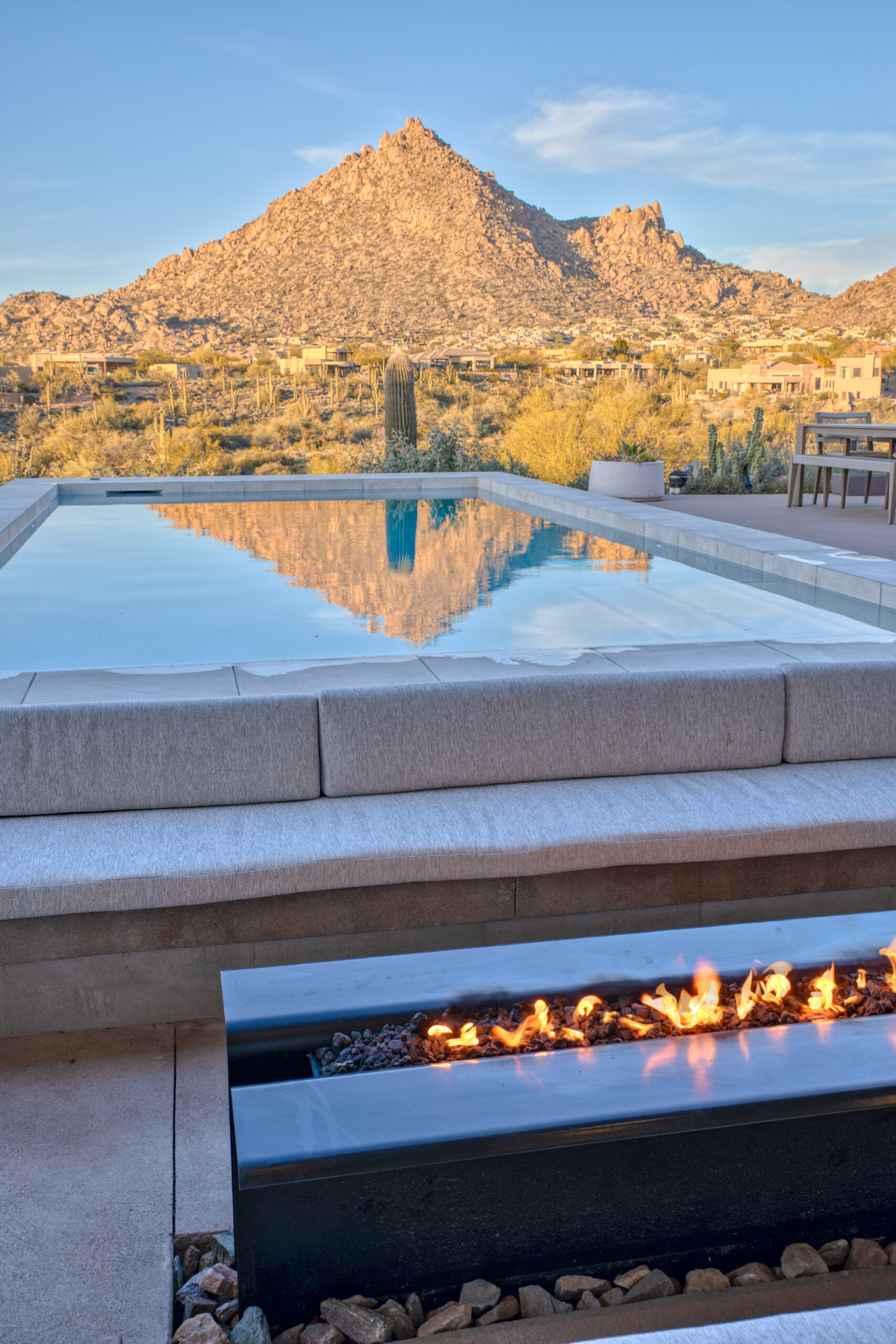 The centerpiece of the space is a sleek, modern pool positioned to frame unobstructed mountain views, complete with a Baja shelf and integrated lighting that transforms the space from a serene daytime retreat into a dramatic evening experience. Just steps away, a sunken fire lounge offers a more intimate setting — designed for conversation, relaxation, and enjoying Arizona’s desert nights.